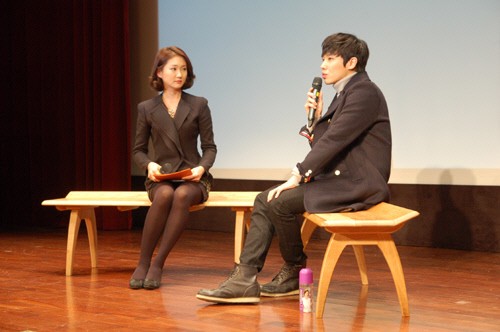 엠블랙 이준이 장인가구가 협찬한 오사카 벤치의자에 앉아 토크콘서트를 진행하고 있다.