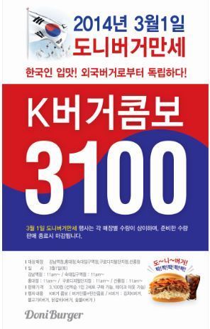 3월1일 '도니버거만세' 행사는 강남역점, 홍대점, 숙대입구역점, 구로디지털단지점, 선릉점 5개 매장에서 진행된다.