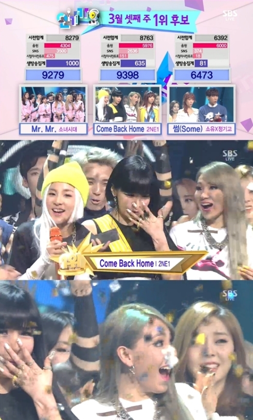 3월 16일 오후 방송된 SBS 음악프로그램 ‘SBS 인기가요’에서는 투애니원의 ‘컴백홈’, 소녀시대의 ‘미스터미스터’ 그리고 소유X정기고의 ‘썸’이 1위 대결을 펼쳤다.