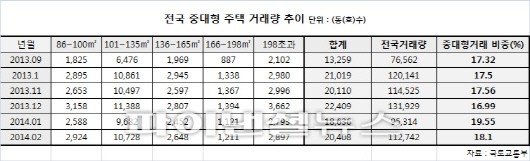실제 부동산 114 조사에 따르면 올해 전국에서 입주 예정인 전용 85㎡ 초과 중대형 아파트는 2만8522가구로 1991년 이후 가장 낮은 수치를 기록했으며 올해 전체 입주물량(26만7713가구)은 지난해보다 38% 늘었지만 중대형은 20% 감소했다. 중대형 입주물량은 2010년 10만2141가구, 2011년 5만4607가구, 2012년 4만9968가구, 2013년 3만5451가구 등으로 매년 감소하고 있다.