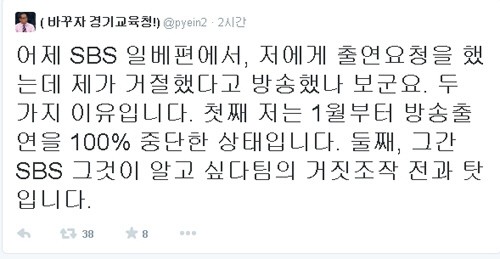 이와 관련, 변희재 대표는 4일 자신의 트위터에 "어제 SBS 일베(일간베스트)편에서 저에게 출연요청을 했는데 제가 거절했다고 방송했나 보다"라고 말문을 열었다.