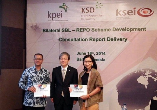 한국예탁결제원은 16일 인도네시아 발리에서 인도네시아 청산보증기관(KPEI) 및 중앙예탁결제기관(KSEI)과 함께 증권대차.환매조건부채권매매(Repo)시스템 구축 컨설팅 최종보고서 전달식을 가졌다. 왼쪽부터 하산 파우지 인도네시아 청산보증기관 사장, 박영호 한국예탁결제원 본부장, 마거릿 탕 인도네시아 중앙예탁결제기관 전무이사.