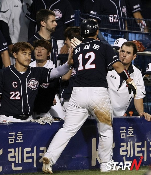'2014 한국야쿠르트 세븐 프로야구' 두산 베어스와 LG 트윈스의 경기가 9일 오후 잠실구장에서 열린 가운데 8회초 무사 1,3루상황 두산 민병헌 타격때 3루주자 최재훈이 홈인해 선수들과 기쁨을 나누고 있다.