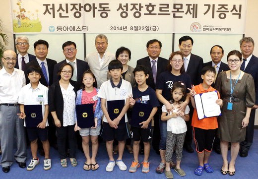 동아에스티(이하 동아ST)는 22일 사회복지법인 한마음사회복지재단과 함께 성장호르몬제 '그로트로핀Ⅱ 주사액'을 저신장증 어린이들에게 전달하는 기증식을 개최했다. 동아ST와 한마음사회복지재단 관계자 및 기증식에 대표로 참석한 저신장증 어린이와 가족들이 기념촬영을 하고 있다.