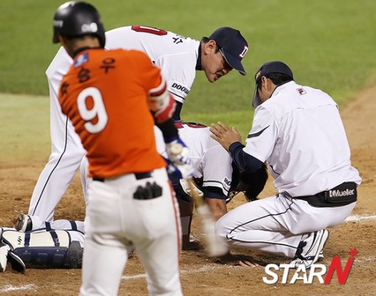‘2014 한국야쿠르트 세븐 프로야구’ 한화 이글스와 두산 베어스의 경기가 12일 오후 잠실구장에서 열린 가운데 9회초 1사 주자없는 상황 두산 최재훈이 한화 추승우의 파울타구에 맞고 고통스러워하고 있다.
