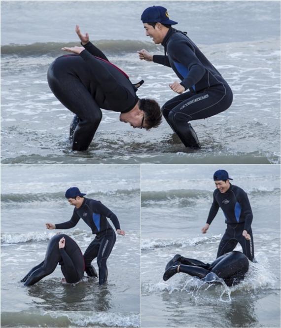 무엇보다 바닷물로 곤두박질 친 데프콘은 자연스럽게 입수를 해 웃음을 자아내고 있다. 갈 곳을 잃어버린 육중한 데프콘의 ‘앞구르기 입수’에 함께 있던 김주혁은 웃음을 참지 못하고 즐거워하고 있는 상황.