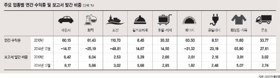 올해 최다 보고서 발간 업종은 자동차(2064종)였다. 최근 5년간 2011년을 제외한 나머지 4년동안 보고서 발간 수 1위 업종으로 자리매김했다. 자동차 업종 보고서 수는 2011년 1583종에서 2014년 2064종으로 꾸준히 늘었다.