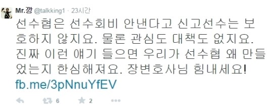 이와 관련, 강병규는 18일 자신의 트위터에 "선수협은 선수회비 안낸다고 신고선수는 보호하지 않는다. 물론 관심도 대책도 없다"며 "진짜 이런 얘기 들으면 우리가 선수협 왜 만들었는지 한심해진다.