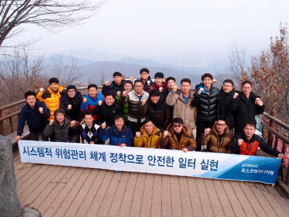 지난 24일 포스코엔지니어링 안전관리자들이 세종시 오봉산 정상에서 안전기원행사를 개최한 후 기념사진 포즈를 취하고 있다.