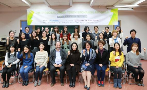지난 23일 열린 '제1기 글로벌 도시화 청년 교류 프로그램' 발대식에서 UN-해비타트 더글라스 라간 청년국장(첫줄 왼쪽 4번째), 덕성여대 박상임 총장직무대리(첫줄 왼쪽 5번째), 정인재 대외협력처장(첫줄 왼쪽 6번째)과 학생들이 파이팅을 외치고 있다.