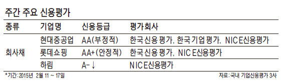 현대중공업의 무보증사채 신용등급은 'AA', 등급전망은 '부정적'으로 평가됐다. 지난해 이 회사는 대규모 영업적자가 발생한데 이어 유가 하락 등으로 저하된 수주여건과 부진한 수주실적 등이 영향을 미쳤다.