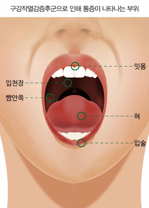 통증은 주로 혀 부위에 나타나지만 잇몸, 입술, 뺨 안쪽 및 입천장에도 나타난다. 화끈, 따끔, 얼얼한 느낌이 지속되고 오전보다 오후에 통증이 심해지기도 한다. 금속이 접촉되었을 때처럼 신맛이 강하게 느껴지고, 입마름이 자주 느껴지기도 한다.