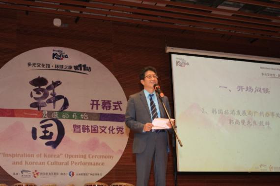 한국관광공사는 중국 광저우 시립 도서관에서 '2015 한국무노하의 달' 행사를 5월 10일까지 개최한다고 12일 밝혔다. 곽상섭 한국관광공사 광저우지사장이 축사를 하고 있다.