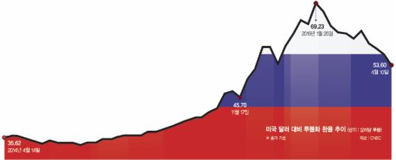 지난해 초 달러당 33루블에서 12월 한때 장중 최고 80루블까지 폭락했던 루블 가치는 지난주 52루블 수준까지 올라갔다.