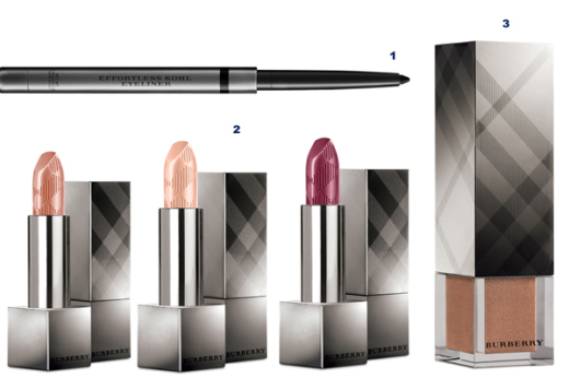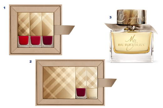2. 런던 컬러 인 엘에이: 골드 글로우 루미나이징 파우더, 아이코닉한 컬러 옥스 블러드 립스틱과 네일, 버버리 메이크업 클래식 3종으로 구성됨.