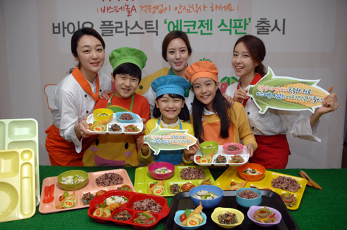 SK케미칼 모델들이 친환경 바이오 소재인 `에코젠`을 사용한 식판을 소개하고 있다.