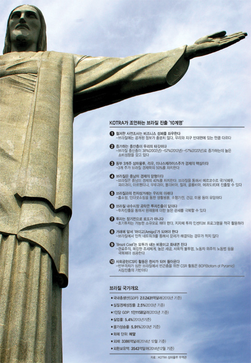 【 상파울루(브라질).서울=이영선 상파울루 무역관장 안승현 기자】 지난 4월 박근혜 대통령이 중남미 4개국을 순방했을 때 함께 따라나선 경제사절단에는 총 125개 기업이 참여했다. 이는 역대 최대 규모다. 경제사절단이 방문한 브라질, 칠레, 콜롬비아, 페루 등 4개국은 모두 국가 현대화 정책으로 대규모 인프라 프로젝트 발주가 증가하고 있다. 우리 기업들이 많은 관심을 쏟는 이유가 바로 이 때문이다. 이 중 가장 주목받고 있는 나라는 바로 중남미의 '맏형' 격인 브라질이다. 아직까지 독특한 관료주의 문화와 복잡한 세금제도, 수출입제도, 부족한 산업인프라 때문에 해외 기업들에 진입이 쉬운 시장은 아니다. 그러나 2억명의 내수시장과 풍부한 지하자원 덕분에 중남미 국가 중 가장 높은 성장잠재력을 가진 것으로 평가받고 있다.