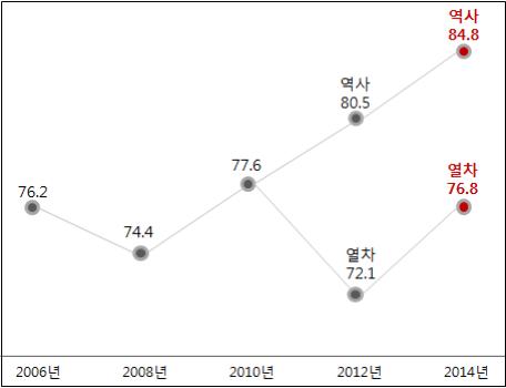 26일 국토교통부에 따르면 '2014년도 철도서비스 품질평가'를 시행한 결과 코레일이 열차 부문에서 76.8점, 역사 부문에서 84.8점을 각각 기록해 지난 2012년보다 4점 이상 높은 점수를 받은 것으로 집계됐다.