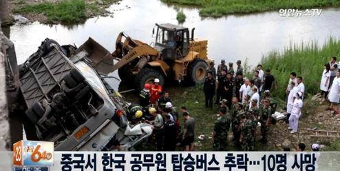 중국 버스추락중국 단동에서 다리 아래로 버스가 추락해 연수중인 우리나라 소속 지방공무원 11명이 사망하는 사고가 발생했다.2일 행정자치부는 지방행정연수원 중견리더과정 148명(지원관 5명 포함)이 ‘고구려·발해·항일독립운동유적지 역사문화탐방’ 현장학습 중, 집안에서 단동으로 이동하던 6대의 차량(중국현지차량) 중 한 대가 중국 현지시간으로 7월1일(수요일) 15:30경 교량 아래로 추락했다고 밝혔다.사고 직후 지안시 의료진 10여명이 현장에서 의식이 없는 승객들을 대상으로 심폐소생술 등의 응급조치를 취한 것으로 알려졌다. 하지만 이 과정에서 6~7명이 목숨을 잃었다.이 버스에는 전국 각 시도에서 모인 지방행정연수원 교육생 24명과 연수원 직원 1명, 현지 가이드 1명 등 한국인 26명과 중국인 2명이 타고 있었다.사망자 11명은 지방직 5급 공무원인 9명의 교육생과 한국인 가이드 1명, 중국인 운전기사 1명으로 파악됐다.