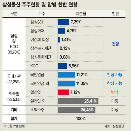 현재 KCC가 장내에서 매입한 지분과 삼성SDI·삼성화재 등 계열사, 최대주주 일가가 보유한 지분을 더하면 확정된 찬성표는 19.78%가 된다. 엘리엇 지분 7.12%를 포함, 반대 의사를 내비친 일성신약(2.11%)과 네덜란드연기금 등을 합치면 반대표는 9.53%가량이다.