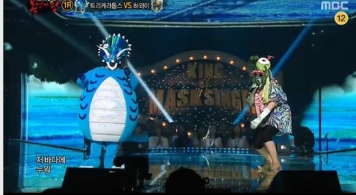 '복면가왕' 트리케라톱스 vs 하와이9일 방송된 MBC 미스테리 음악쇼 '복면가왕'에서는 고추아가씨의 가왕 자리를 위협하는 8명의 출연자들이 가왕에 도전했다.이날 두 번째로 무대에 나선 트리케라톱스와 하와이는 '저 바다에 누워'를 선곡해 폭발적인 가창력을 뽐냈다.김형섭은 "뮤지컬을 보는 것 같이 신나게 들었다. 성량이나 몸동작을 볼 때 하와이는 뮤지컬 배우 같다. 트리케라톱스는 인형 옷이 진짜 몸인 것처럼 성량이 좋다"고 답했다.윤일상은 "트리케라톱스는 목소리 톤을 만들어서 나온 것 같다.