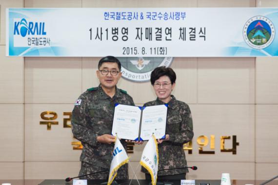 코레일이 11일 국군수송사령부와 '1사 1병영' 자매결연을 체결했다. 코레일은 장병들의 사기 진작과 부대 발전을 위해 소정의 후원금과 위문품을 전달하는 한편 장병들이 사회진출에 필요한 취업·채용정보를 제공하기로 했다. 최연혜 코레일 사장(오른쪽)과 윤국 국군수송사령관이 자매결연 체결식을 마친 뒤 포즈를 취하고 있다.