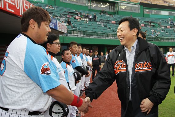 롯데자이언츠 야구단을 적극 지원하겠다는 의사를 밝힌 신동빈 롯데그룹 회장이 첫 걸음으로 지난 11일 부산 사직구장을 찾아 선수들을 격려했다. 신 회장(오른쪽)이 롯데자이언츠 최준석 선수와 악수하며 격려의 말을 전하고 있다.