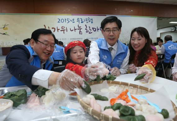 16일 서울 강동구 성내종합사회복지관에서 열린 '한가위 나눔 한마당' 행사에서 이광구 우리은행장(오른쪽 두번째)이 송편을 빚고 있다.