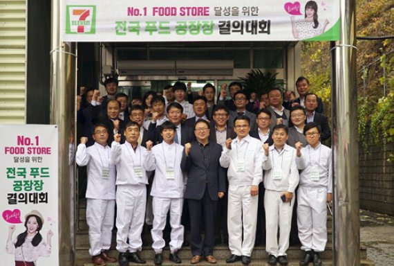 편의점 세븐일레븐은 13일 경기 용인시 롯데푸드 용인 공장에서 본사 및 공장 임원,협력업체 대표 등이 참석한 가운데 'No.1 푸드 스토어 결의 대회'를 갖고 고품질 상품생산과 위생기준 강화,불량률 제로화 등을 통해 국내 최고 '푸드 스토어'로의 도약을 선언했다.김건수 제주 에코푸드 대표, 염종찬 담연 대표, 김종욱 제주 모심푸드 대표, 정승인 세븐일레븐 대표, 김창식 롯데푸드 광주공장장, 홍기영 롯데푸드 용인공장장, 문철환 롯데푸드 부산공장장(앞줄 왼쪽부터) 등 관계자들이 파이팅을 외치고 있다.