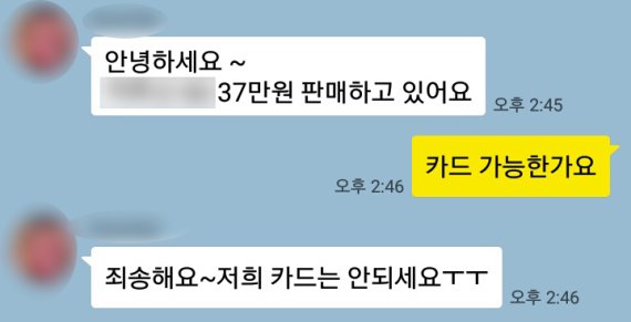 블로그를 통해 가방을 판매하는 업자에게 카드 결제 가능 여부를 묻자 불가능하다는 답변이 돌아왔다.