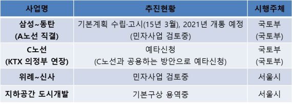 서울 지하철 2호선 삼성역과 9호선 봉은사역 사이 영동대로(길이 630m·폭 75m) 지하공간에는 다수의 철도사업이 얽혀 있다. 국가철도사업인 삼성~동탄 광역급행철도와 수도권 광역급행철도 C노선, 서울시가 계획한 위례~신사 도시철도 등이 계획돼 있다.
