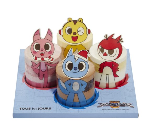 ‘고고 최강전사 미니특공대(권장소비자가 1만 9000원)’는 딸기, 망고, 요거트, 초코의 네 가지 맛 무스케이크를 모두 맛볼 수 있는 실용적인 제품이다. 작은 원형의 무스 케이크 하나 당 주인공 캐릭터를 하나씩 담은 깜찍하고 특색 있는 모양이 눈길을 끄는 제품이다.