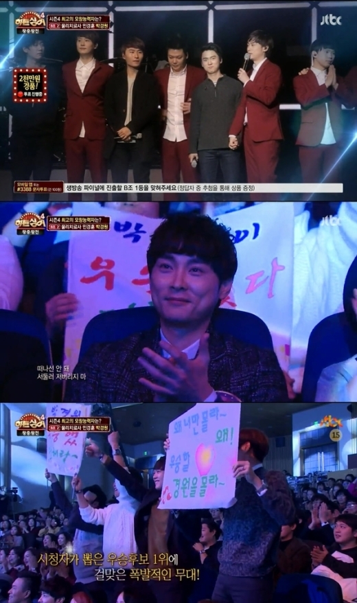 버즈 민경훈이 출연한 JTBC ‘히든싱어4 - 왕중왕전’에서 ‘민경훈 모창능력자’ 탈락의 고배를 마셨다.지난 9일 방송된 히든싱어4 에서는 생방송 진출자 TOP3 이 결정되는 장면이 방송되었다. ‘히든싱어4 - 왕중왕전’ 생방송 진출자는 A조 '내 사람 김진호' 김정준, B조 ‘완도 소찬휘’ 황인숙, C조 ‘듣기 평가 거미’ 이은아 TOP3 이 선정됐다.하지만 ‘히든싱어 와일드카드’는 9일 방송이 끝난 후 히든싱어4 홈페이지를 통해 아쉽게 탈락한 모창 능력자 10명 중 생방송 파이널 무대에 진출할 단 1명을 투표로 뽑는 것으로 또 다른 생방송 진출자가 누가 될지 시청자들의 관심이 집중되고 있는 상황.시청자가 뽑은 우승후보 1위로 뽑혔던 ‘물리치료사 민경훈’ 박경원은 이번에도 시청자들에 의해 파이널 무대에 진출할 수 있을지 귀추가 주목된다.