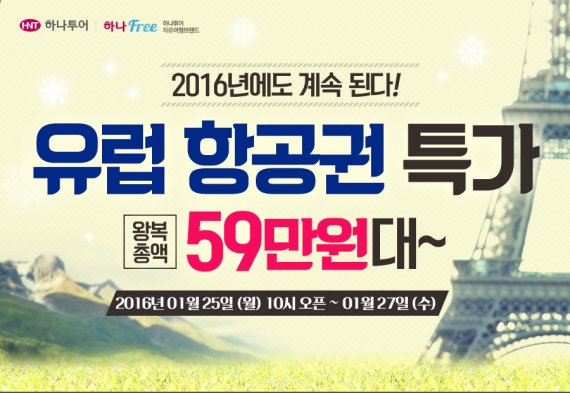 하나투어가 25일부터 27일까지 단 3일간 '유럽항공권 특가' 이벤트를 진행한다. 파리, 로마, 런던, 바르셀로나, 자그레브 등 인기노선이 참여하는 본 이벤트는, 하나투어닷컴·하나Free항공 모바일 고객 대상으로 진행되며, 유류할증료 및 텍스 포함 최저항공권 기준으로 자그레브 59만원 대, 로마 66만원 대 등 최대 40% 할인된 특가 운임을 제공한다. 노선별 자세한 사항은 25일 오전 10시부터 관련 기획전(http://me2.do/xpxF392y)을 통해 확인 가능하며, 구매고객 대상으로 100명 추첨을 통해 네스카페 돌체구스토를 증정하는 행사 또한 진행될 예정이다. 이 외에도, SM면세점 1만원 선불카드 증정, 동일조건의 저렴한 항공권 발견 시 차액 300%를 마일리지로 보상하는 최저금액 보상제 등 구매자 대상 다양한 혜택이 있다.