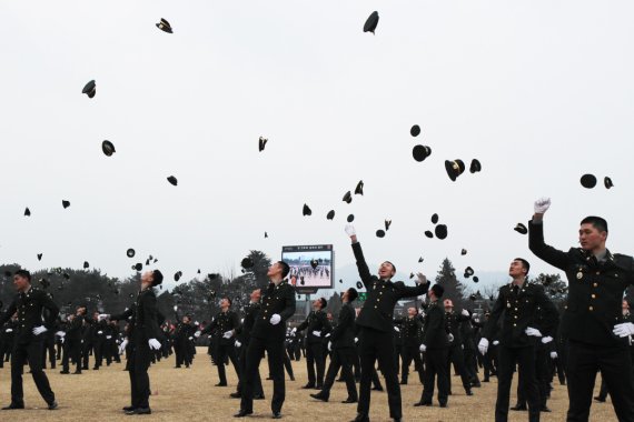 신임부사관들이 임관을 자축하며 정모를 던지고 있다