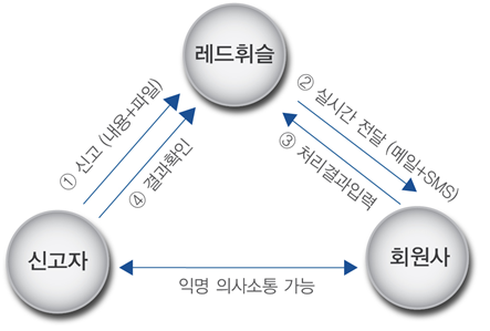 신고자가 PC와 스마트폰을 통해 신고서를 작성·제출하면 보안서버와 보안시스템을 통해 회원사의 담당자에게 해당 내용이 이메일과 단문메시지서비스(SMS)로 전달된다.