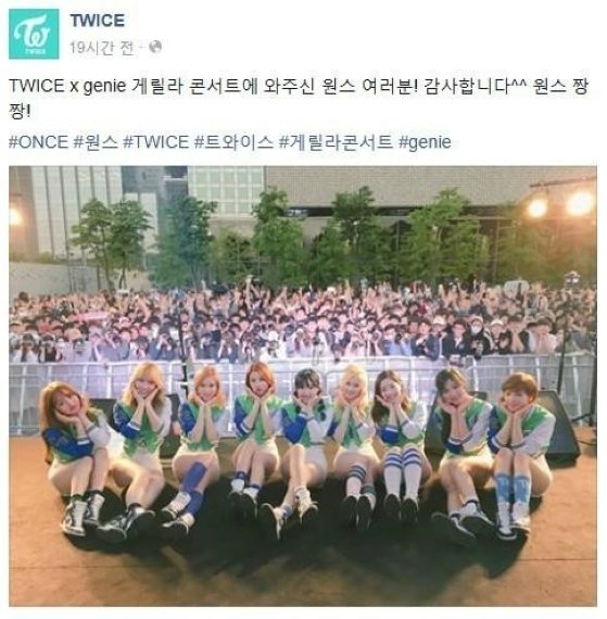 트와이스는 사진과 함께 "TWICE x genie 게릴라 콘서트에 와주신 원스 여러분! 감사합니다^^ 원스 짱짱!"라는 글을 남겨 관심을 모았다.