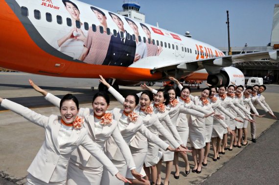 애경그룹 계열의 저비용항공사(LCC) 제주항공은 16일 모델인 배우 송중기를 래핑한 항공기를 공개했다. 이 항공기는 김포~제주, 청주~제주, 부산~제주, 대구~제주, 김포~부산 등 5개 국내선과 중국, 일본, 대만, 태국 등 한류 인기가 높은 노선에 투입한다. 제주항공 신입 승무원들이 서울 공항동 김포국제공항에서 배우 송중기가 래핑된 항공기 앞에서 기념촬영을 하고 있다.