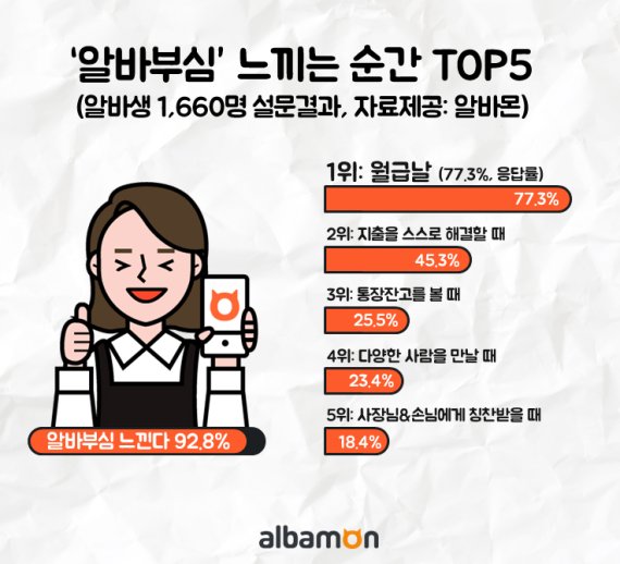 취업포털 잡코리아가 운영하는 아르바이트 포털 알바몬이 알바생 1660명을 대상으로 ‘아르바이트 하기를 잘했다고 느낄 때’를 묻는 설문조사를 실시한 결과, 알바생 77.3%가 월급을 받을 때를 꼽았다고 10일 밝혔다.
