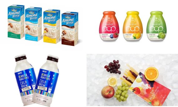 아몬드 브리즈, 쁘띠첼 워터팝, 저스트주스 아이스, UCC콜드브루커피(왼쪽 위부터 시계 방향으로 )