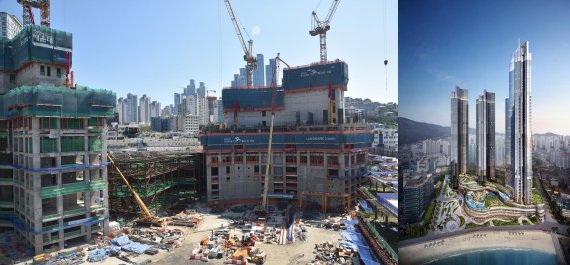 공정률 15%인 엘시티 공사현장(왼쪽)과 조감도.