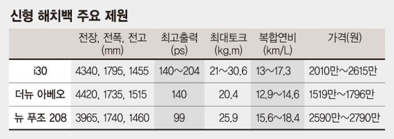 11일 업계에 따르면 현대차의 신형 i30는 최근 출시된 세 모델 중 가장 주행성능이 우수하다. 슬로건도 다이내믹한 주행성능을 강조한 '핫 해치'를 내걸었다. 기존 i30의 가솔린 2.0 엔진 대신 가솔린 1.4 터보와 가솔린 1.6 터보 엔진을 새롭게 장착해 중저속 구간에서부터의 동력성능과 연비 경쟁력이 강화된 것이다. 이에 따라 가솔린 1.4 터보 모델은 최고출력 140마력(ps), 최대토크 24.7kgf.m의 성능을, 가솔린 1.6 터보 모델은 최고출력 204마력(ps), 최대토크 27.0kgf.m을 발휘한다.