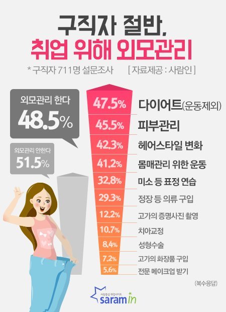 취업시장에서 외모를 중시하는 풍토가 여전한 가운데 구직자 절반은 취업을 위해 외모관리를 하는 것으로 나타났다.