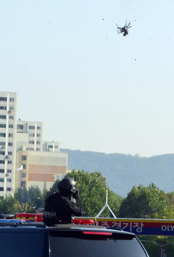 2016 국가 대테러종합훈련이 6일 오후 서울 올림픽로 잠실종합운동장 주경기장 입구에서 열려 민관군 합동 테러진압 시범을 보이고 있다./사진=서동일 기자