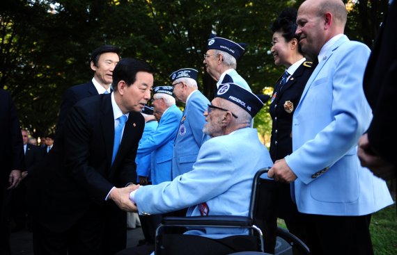 한민구 국방부 장관이 18일(현지시간) 미 워싱턴 한국전 참전기념비를 방문해 한국전쟁 참전 미국과 악수를 나누고 있다. /사진=국방부