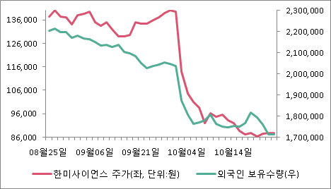 특히 한미사이언스 주가와 상관계수는 0.92로 동업종 중 가장 높은 상관성을 보였다. 최근 1주일 동안 해당 종목의 외국인 순매수량은 3928주로 매수 추세가 약하게 나타나고 있다.