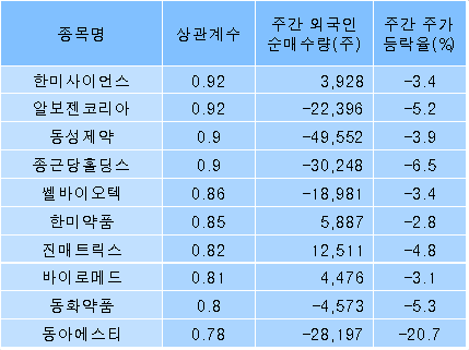 다음은 제약 및 바이오 업종 중 외국인 40일 보유수량과 주가의 상관 계수가 높게 나타난 종목들로 한미사이언스(상관계수: 0.92), 알보젠코리아(0.92), 동성제약(0.9) 등이 있다. 상관 계수의 값은 -1에서 1 사이의 값을 가질 수 있는데, 0.7과 1 사이이면 두 변수가 강한 양의 선형관계가 있다고 해석된다.