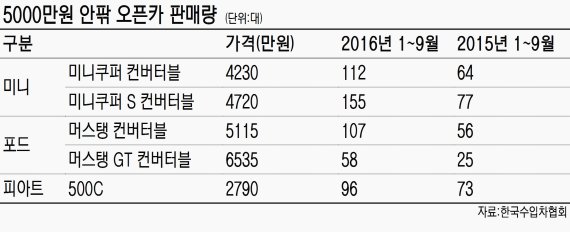 피아트의 500C의 경우에는 올 9월까지 96대가 판매되면서 지난해 동기 판매량(73대)을 웃돌았다. 이들 모델의 공통점은 2000만~6000만원대로, 지붕 개폐가 가능한 컨버터블 중에서도 상대적으로 저렴한 편이다.