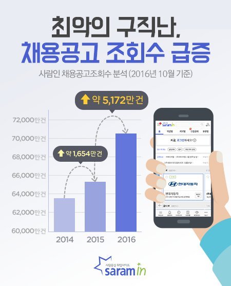 취업포털 사람인이 올해 1월부터 10월까지 자사 사이트에 등록된 채용공고의 조회수를 분석한 결과, 공고 조회수는 총 7억 432만건으로, 전년(6억5260만여건)보다 무려 5000만 건 이상 증가했다.