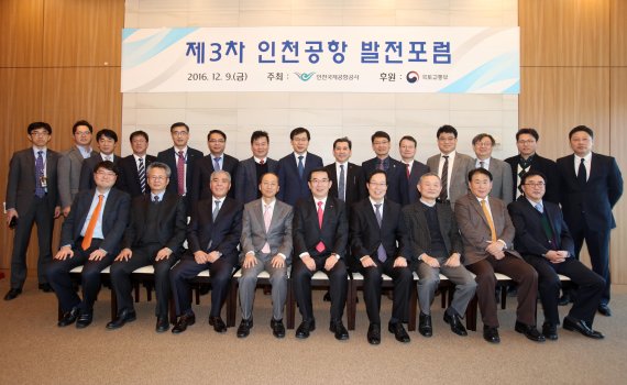 지난 9일 인천공항공사 청사에서 열린 제3차 인천공항 발전포럼에 참석한 정일영 인천공항공사 사장(앞줄 가운데) 등 공사 경영진과 전문가 위원들이 기념촬영하고 있다.